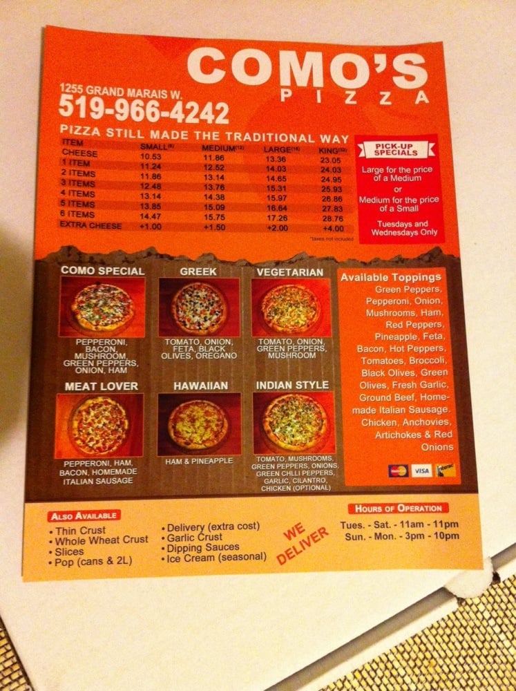 Welcome to Como's Pizza, a true hidden gem in Windsor, Ontario. Located at 1255 Grand Marais Rd W, Como's Pizza is well-known for its unbeatable selection of pizzas and side dishes. From the classic Garlic Breadsticks to crispy Onion Rings, every item is crafted with fresh ingredients and passion.